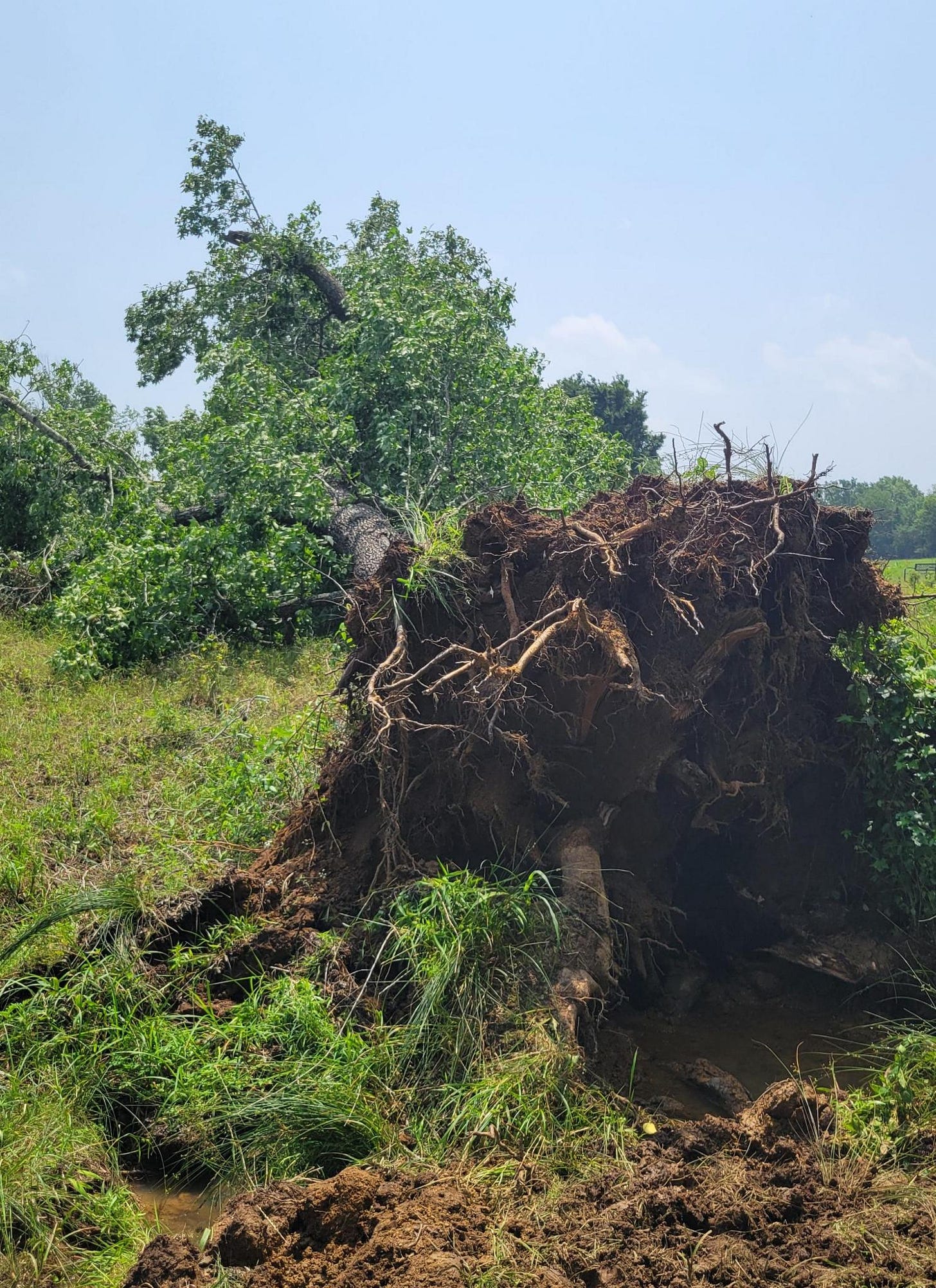 This tree once stood tall and appeared to be quite strong. It was the largest tree in this area of the property. It was standing amongst other trees and brush that would have helped to lessen the impact and the force of the winds that beat upon it. Yet, at the end of the storm, those objects proved to be of no help for this tree. This tree did not have any branches or limbs snapped off by the winds. No… it simply bowed down when the pressure of the winds came upon it. As it bowed and lifted from the ground, its roots were snapped. Its limbs and branches remained green, strong, and intact. However, this will only be temporary. With most of the roots being broken and severed from the source that sustains its life, this tree will face certain death.