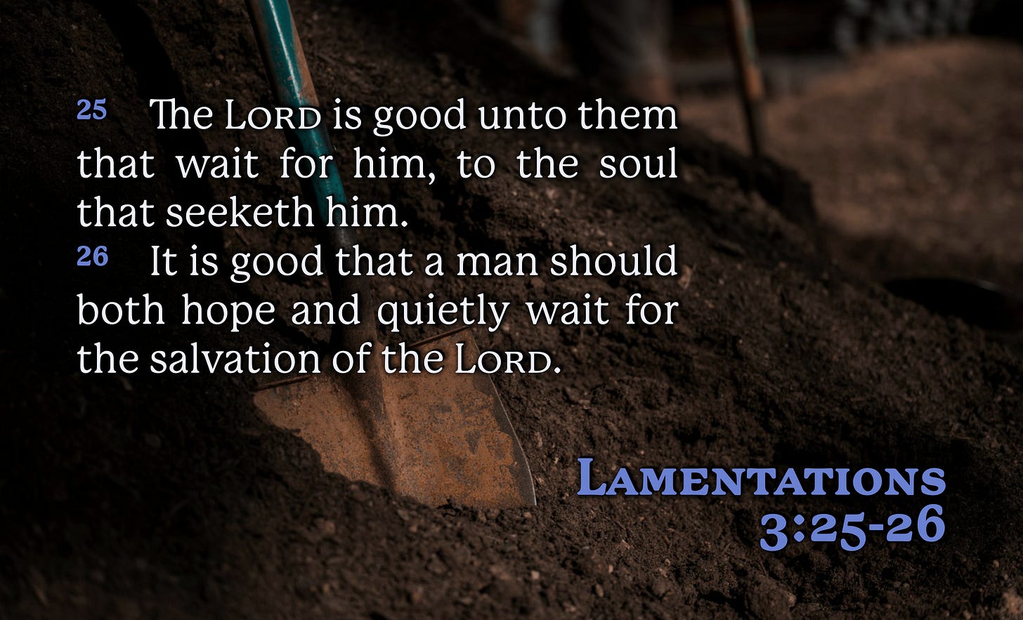 There are times in life where God requires us to wait for Him. We see from this week’s verse that it is good for a person to go through these times of waiting. This verse also speaks to more than just simply waiting. It says that it is good to “quietly wait.”