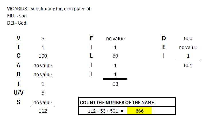 In order to count the number of the name “VICARIUS FILII DEI,” we need to review the Roman numerals and their values. Any letters that are not found in the chart below do not have a numerical value.