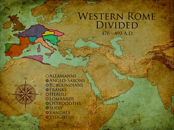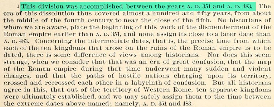 Between 351 and 483 AD, the western Roman Empire was divided into (10) nations. (The Huns [or Allamanni], Ostrogoths, Visigoths, Franks, Vandals, Suevi, Burgundians, Heruli, Anglo-Saxons, and Lombards)