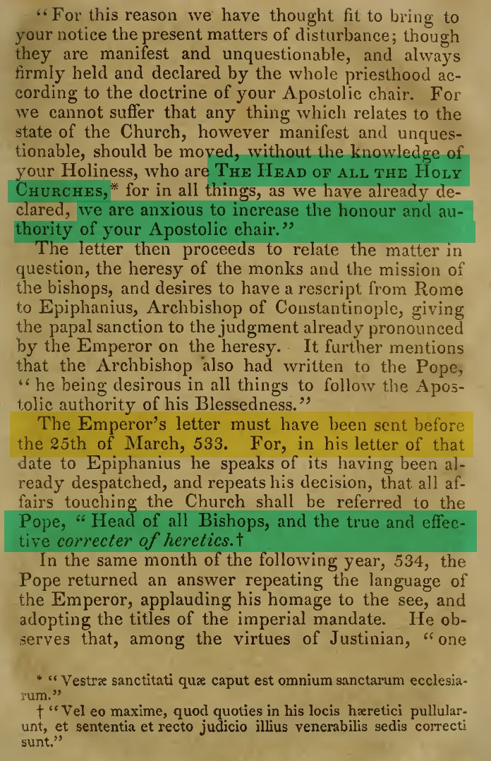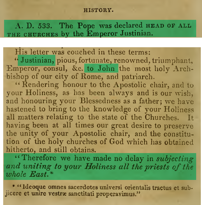 This solidification of this rise was strengthened in 533 AD when Emperor Justinian issued a degree in a letter to Pope John II declaring the pope as the head of all churches and stated his desire to then “increase the honour and authority of your [the pope’s] Apostolic chair.” George Croly, The Apocalypse of St. John, 1827, p114-115: