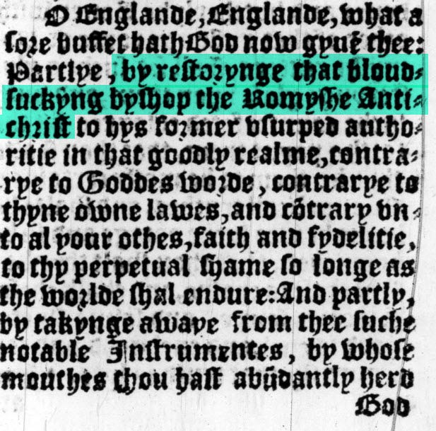 “by restoring that blood-sucking bishop the Romish Antichrist to his former usurped authority in that goodly realm, contrary to God’s word, contrary to thine own laws, and contrary to all your oaths, faith, and fidelity”