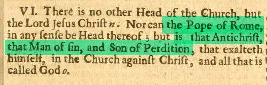 “There is no other Head of the Church, but the Lord Jesus Christ. Nor can the Pope of Rome, in any sense be Head thereof; but is that Antichrist, that Man of sin, and Son of Perdition, that exalteth himself, in the Church against Christ, and all that is called God.”