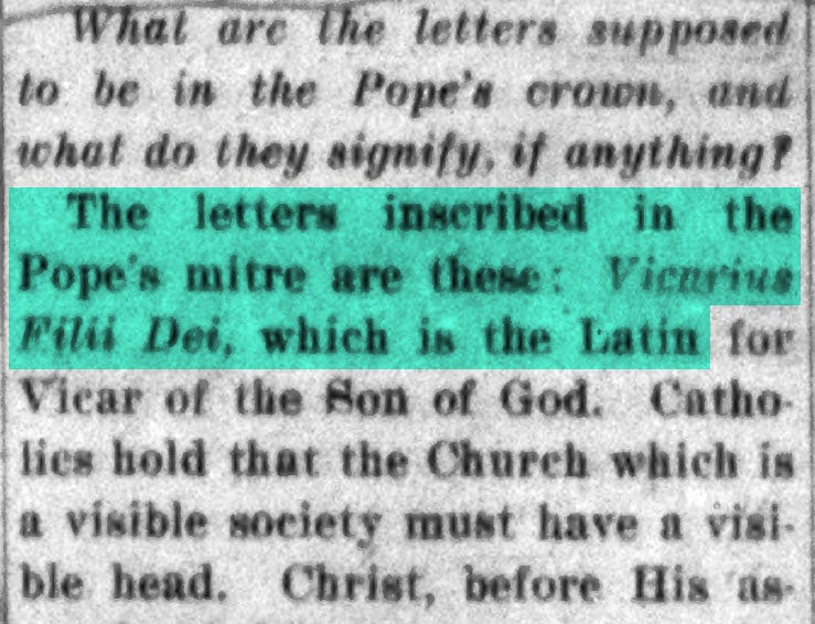 a) We learn from the Catholic publication Our Sunday Visitor, in the Bureau of Information section of the April 18th edition in 1915, that the letters inscribed on the pope’s crown are “Vicarius Filii Dei”: